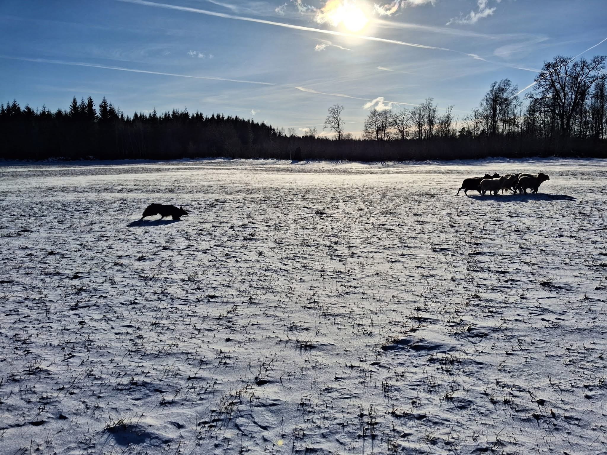 Vintervallning i Jämjö. Foto: Erika Svensson. På bild ser vi unghunden Odd (Knodden), som driver får i ett vintervitt Blekinge och i strålande sol!